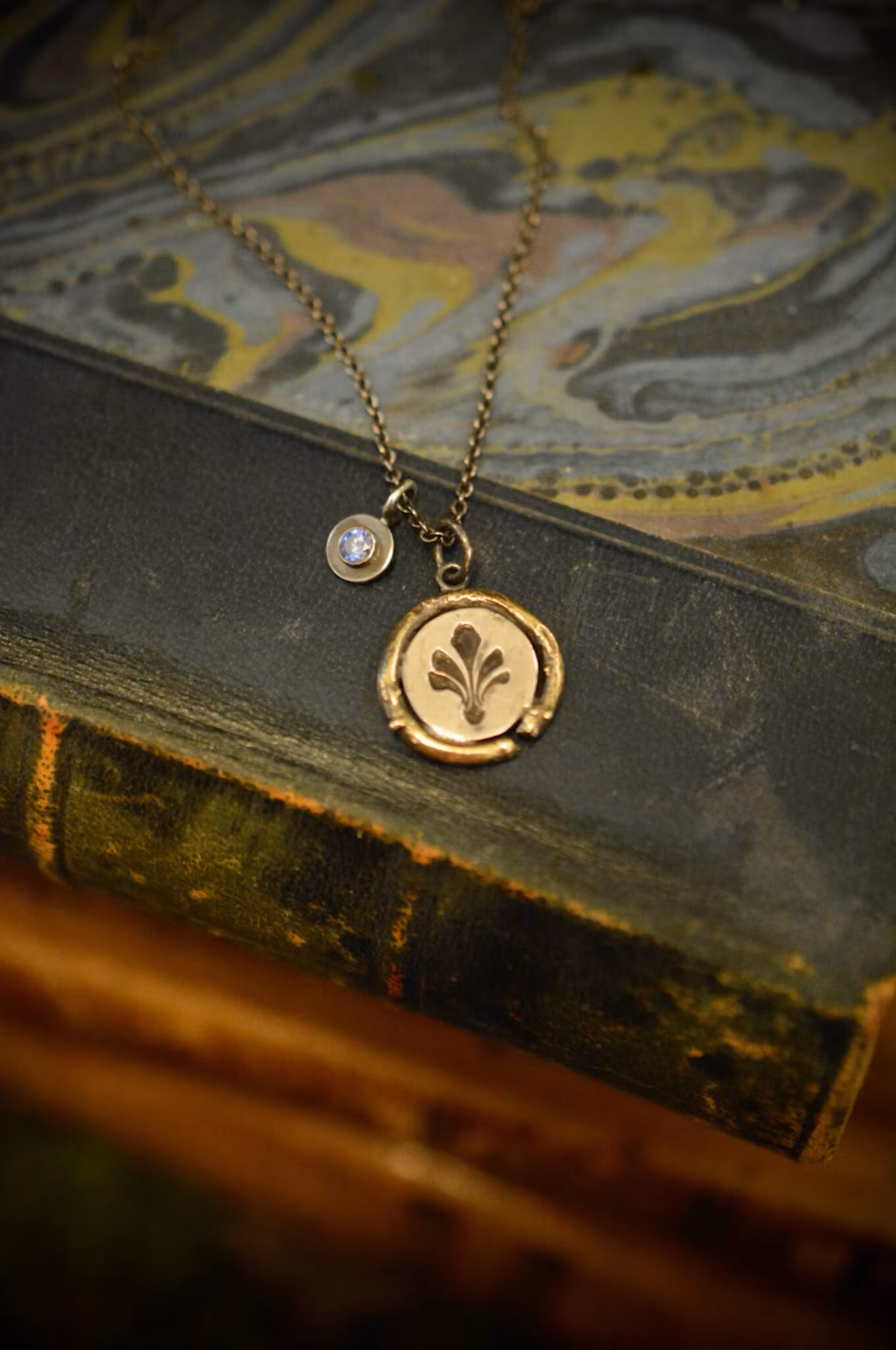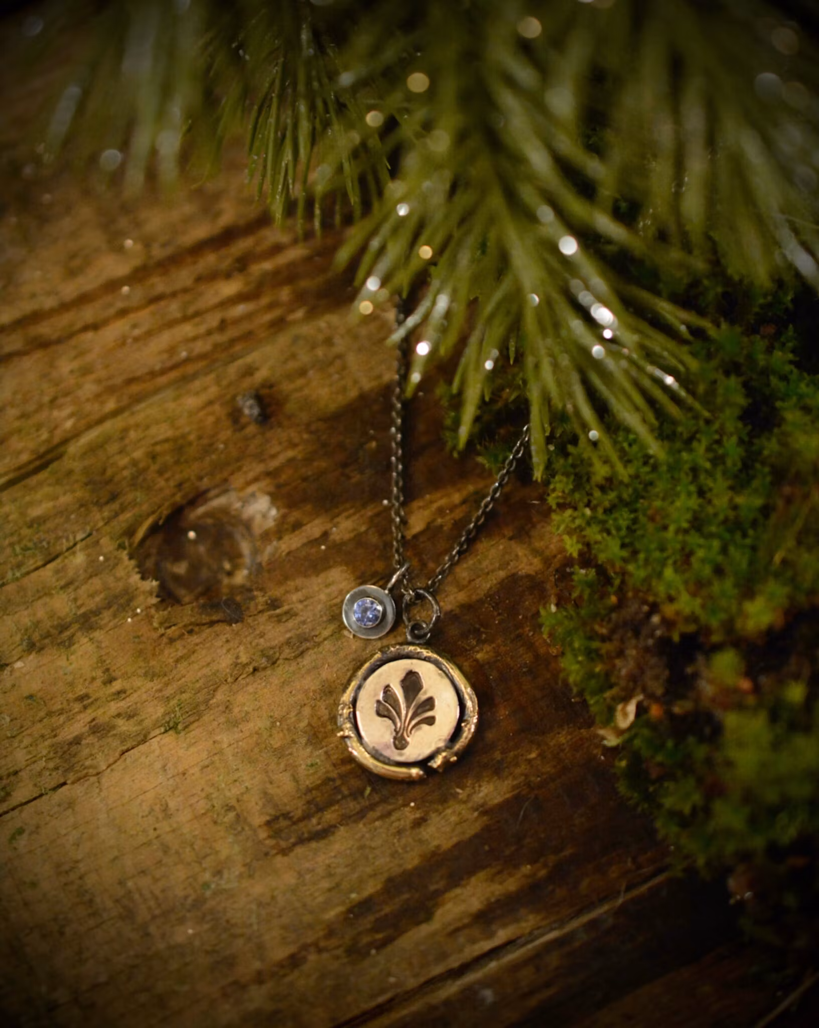 Jag ville mässingen skulle vara knotig och organisk, den skulle påminna om grenar som böjts runt om varje silver medaljong. Med varje smycke medföljer det också en liten lyckoamulett som hänger vid dess sida med en glittrig cubik zirkon infattad.