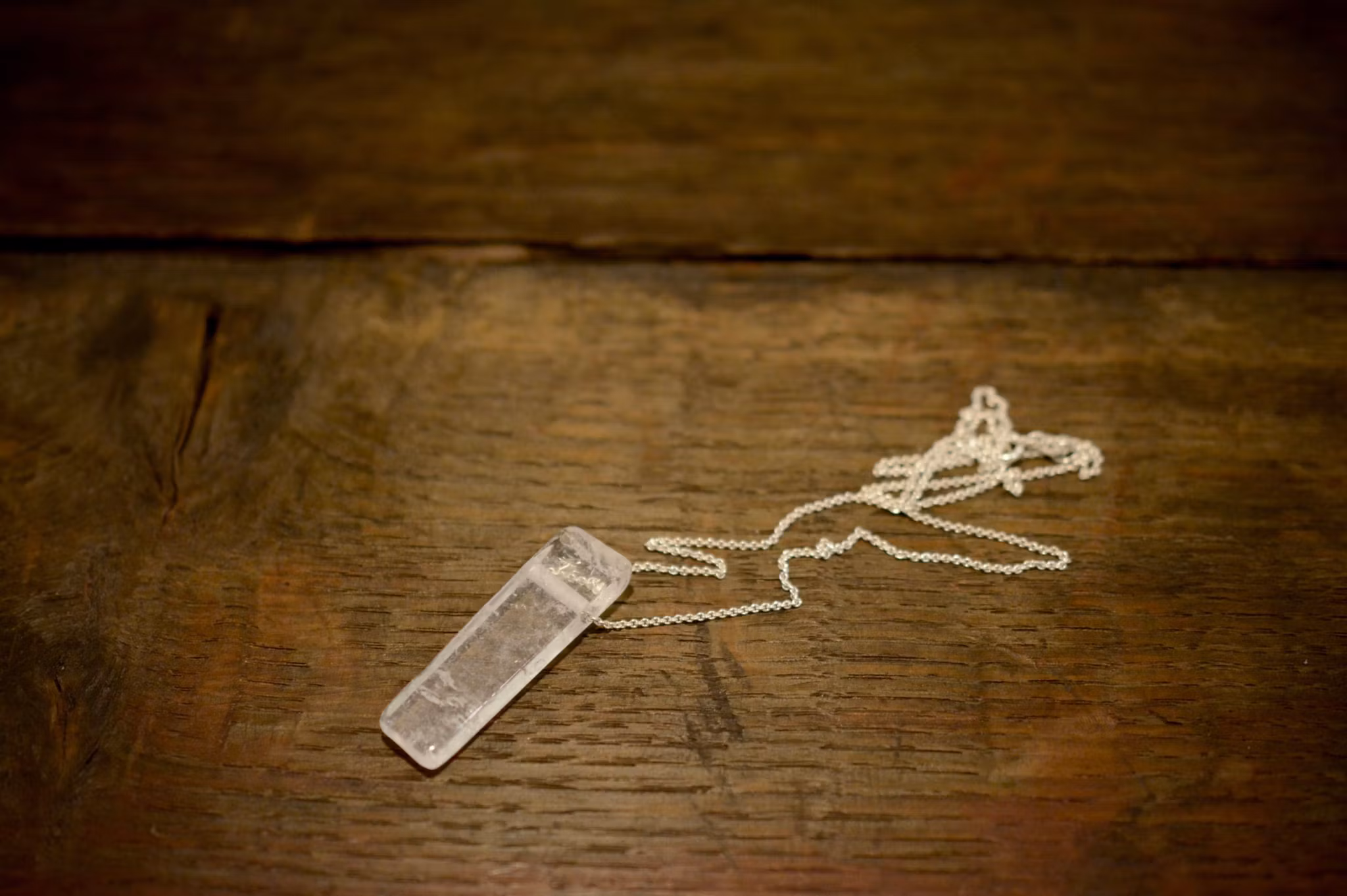 En genomborrad bergkristall, slipad i en rektangulär och enkel form, men väldigt vacker. Kristallen hänger på en tunn silverkedja. Välj önskad längd på kedjan i rullisten. Bär din favorit kristall nära och njut av dess egenskaper. Kristallen mäter ca 3,8 cm lång, 1 -1,2 cm bred och ca 5-6 mm tjock.
