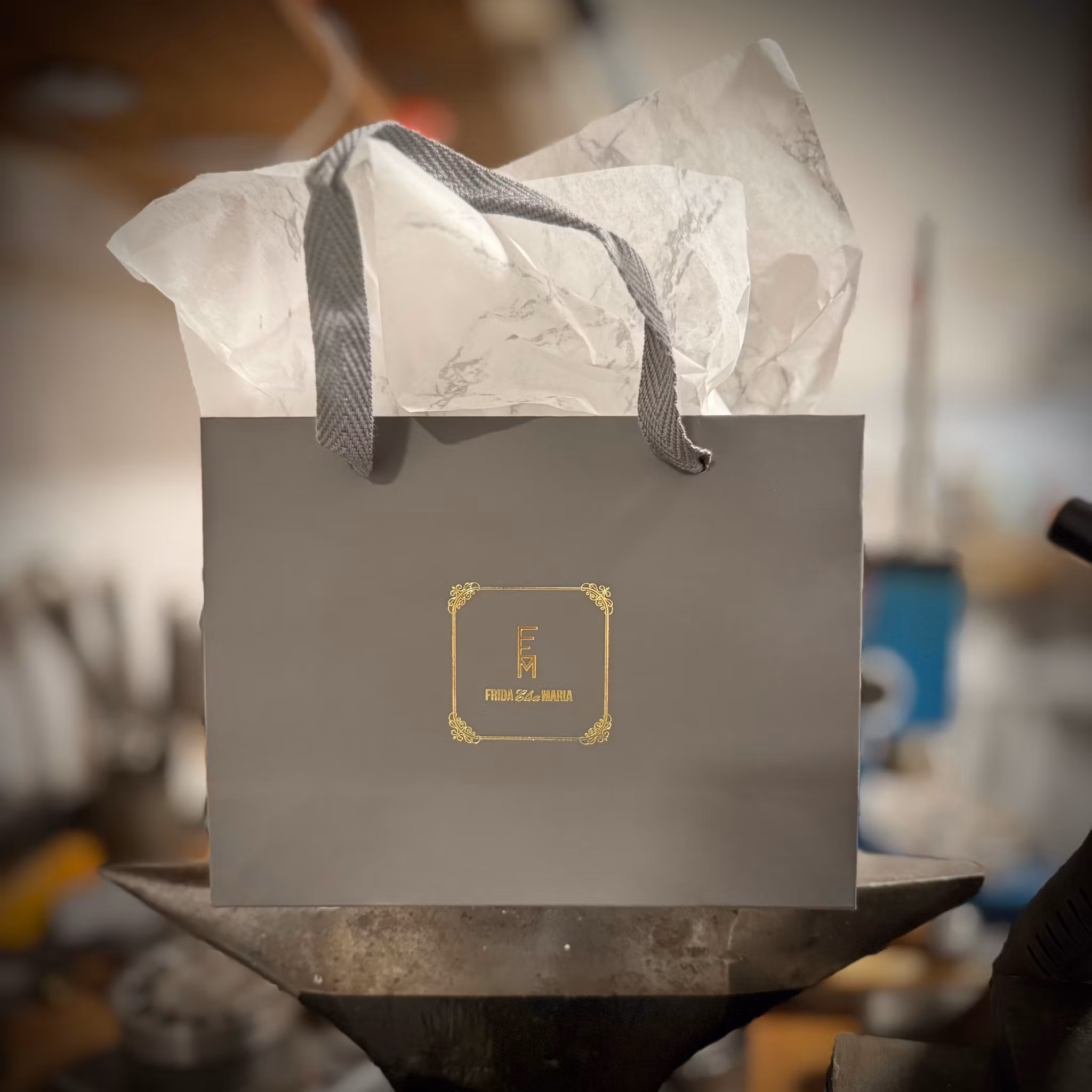 Önskas en bärpåse/ presentpåse med ett ark silkespapper till smycket du köpt, kanske ska det ges bort i present? Denna påse kan vara ett fint komplement. Gjord i kraftig kartong med handtag i vävd bomull. Påsen mäter ca 20 x 15 x 7 cm.